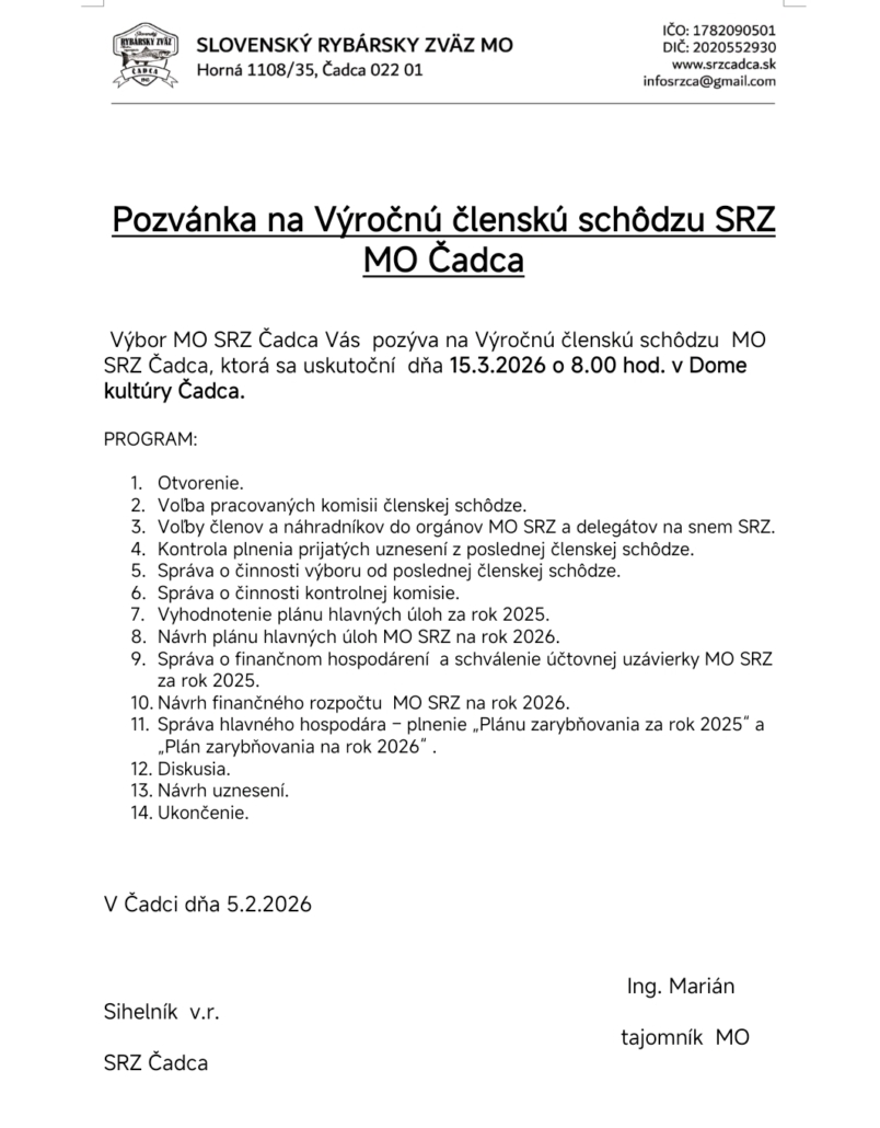 Výbor MO SRZ Čadca Vás pozýva na Výročnú členskú schôdzu MO SRZ Čadca, ktorá sa uskutoční dňa 15.3.2026 o 8.00 hod. v Dome kultúry Čadca.
